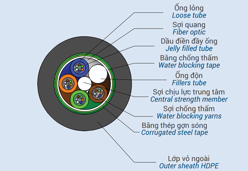 Để đảm bảo khả năng hoạt động ổn định trong môi trường ẩm ướt và chịu nhiều tác động cơ học, cáp quang luồn cống 12FO kim loại được thiết kế với cấu trúc nhiều lớp, mỗi lớp đảm nhiệm một chức năng riêng biệt.